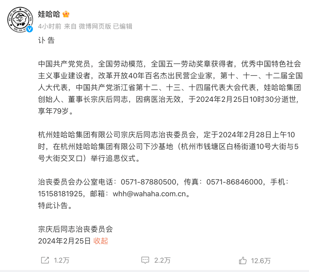 2月25日,娃哈哈官方发布讣告,娃哈哈集团创始人、董事长宗庆后因病去世,享年79岁。
