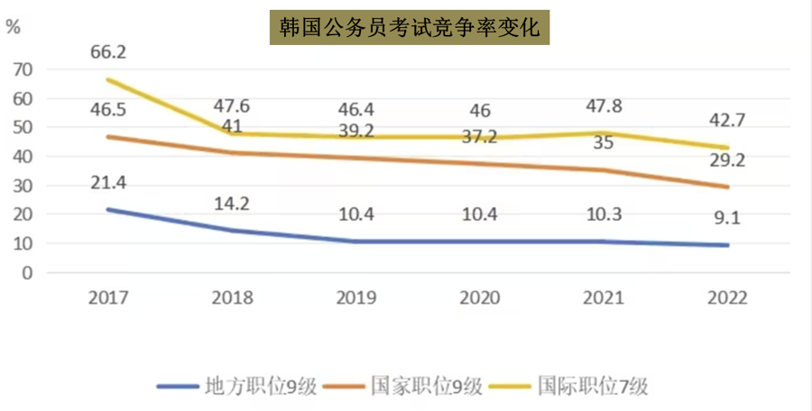 从韩国教育部的数据来看,人均最低工资每年增长5%至7%-8%,而公务员的工资每年增长不到1%,这使得公务员的竞争难度逐年下降。