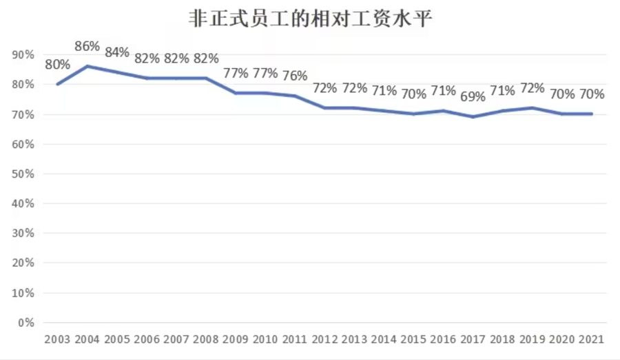 而非正式员工与正式员工的薪资水平差距正在逐年拉大。这导致韩国年轻人不仅要面对求职大企业时的巨大竞争压力,还要担忧在被录用后是否能成为正式员工。
