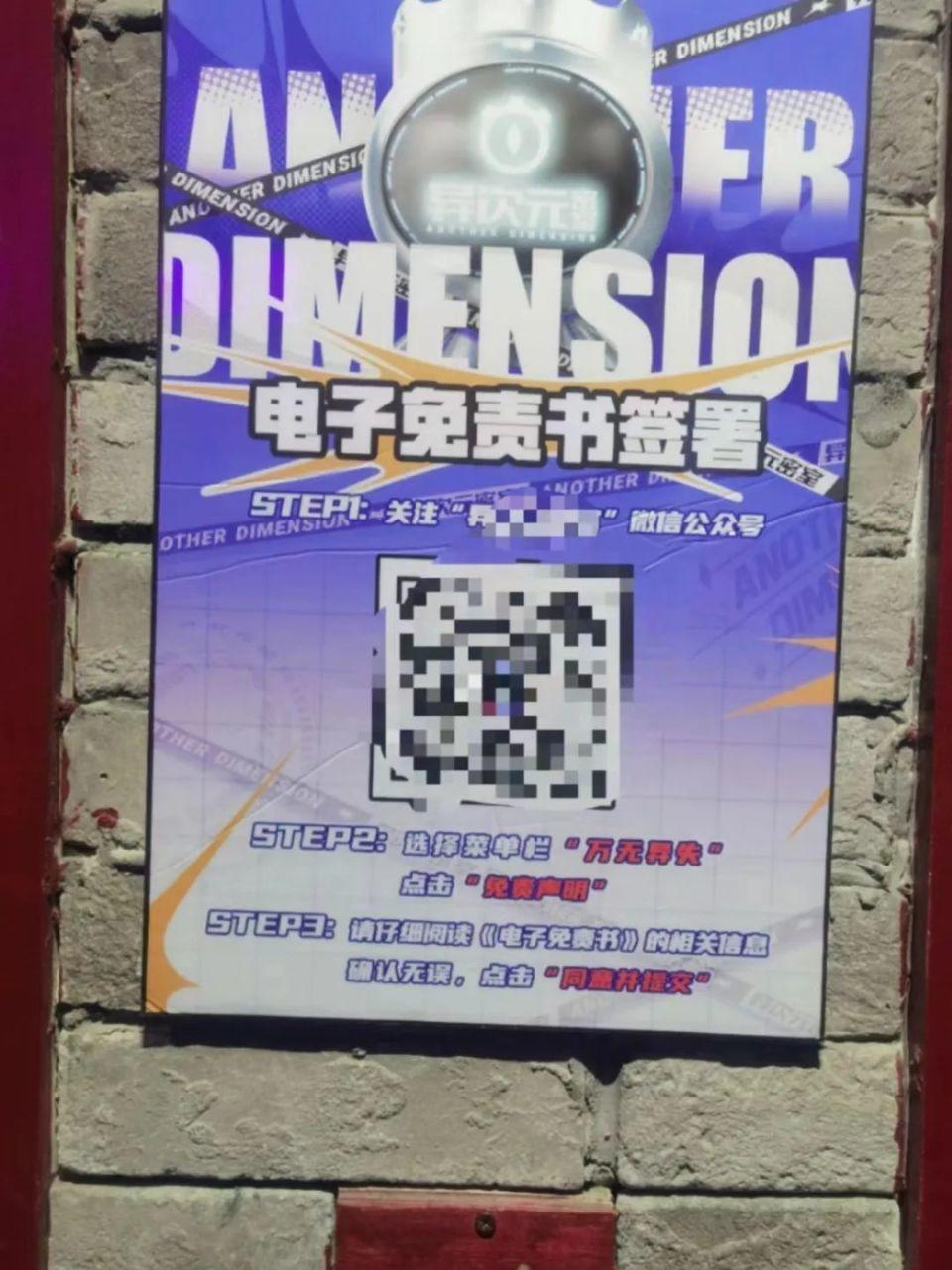 2月28日,记者陪同兰女士来到长沙市世纪情珠宝大厦3楼的异次元密室(国金店)。记者在现场看到,门店大门口摆放着“未成年人需要在成年人陪同下游玩”的警示标语,墙上张贴着一个二维码,上面写着“电子免责书签署”以及使用方法。
