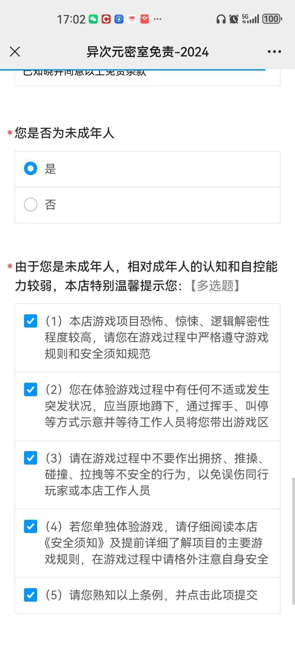 记者按照步骤扫描二维码,关注公众号并选择相应菜单后,会填写一份问卷调查。如果在“您是否为未成年人”的选项里选了“是”,会以多选题的形式出现4段温馨提示,并要求扫码者“熟知以上条例,并点击此项提交。”