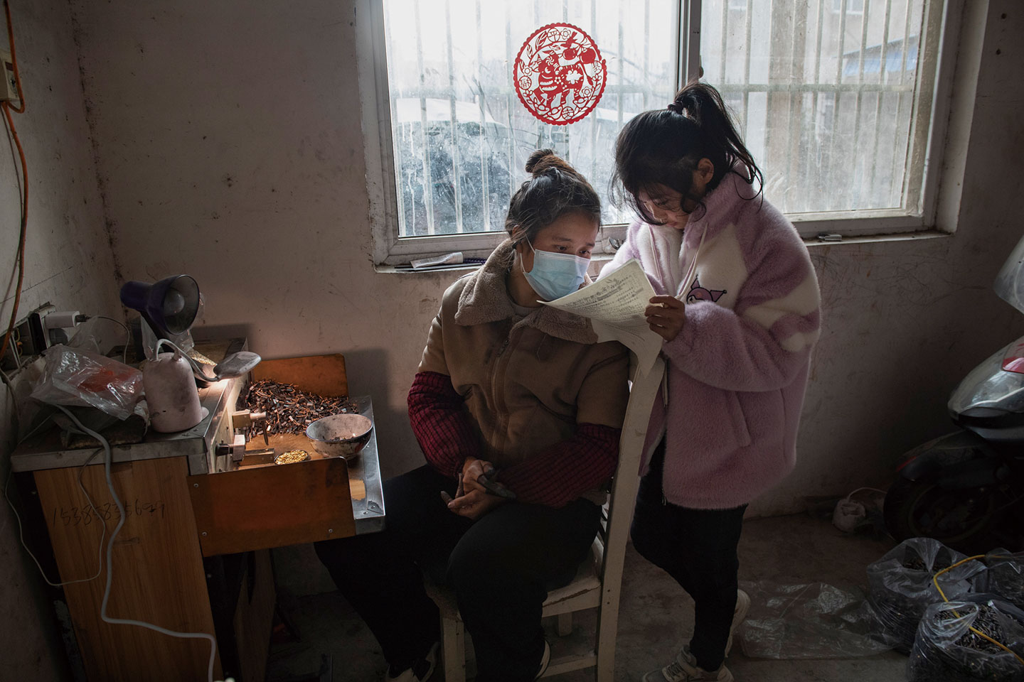 2020年9月,四胞胎开始上小学,朱成珍每天骑着电动三轮车接送孩子。为了补贴家用,朱成珍从附近的工厂里领回材料,在家做一些计件手工,每个月大概有两千元的收入。