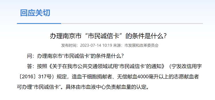 余先生告诉记者,自己是南京人,三年前开始献血,“献的主要是成分血和血小板,折合成全血应该是8500毫升左右。去年江苏省有一个针对献血者的三免政策,在省内献血满4000毫升就可以享受三免政策,其中就包括乘坐公共交通(工具)免费,我觉得挺方便的,就第一时间去办理了这个卡。”记者搜索发现,去年9月18日,人民网江苏频道以“南京为‘三免卡’持有者开通免费刷卡乘坐公共交通功能”为题,报道了此事。去年9月12日,南京市卫健委还发布了江苏省无偿献血荣誉证持有者开通免费刷卡乘坐全市公共交通功能的办理攻略。