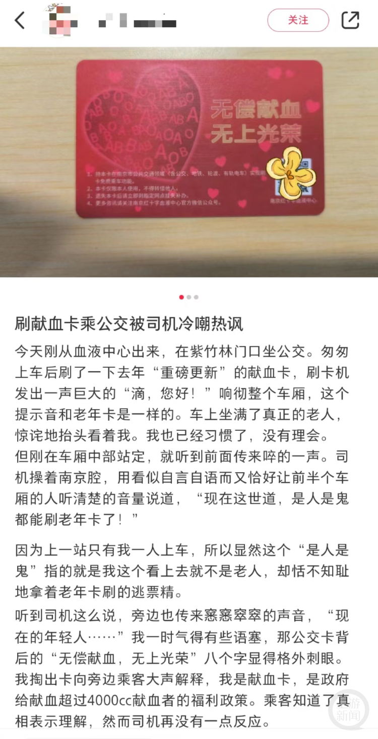 近日,南京市民余先生(化名)在小红书上发帖表示,自己乘坐公交车时,使用南京市民卡公司颁发的献血爱心卡(献血满4000毫升后可凭卡免费乘坐地铁公交等公共交通工具),但这张卡刷卡时的提示音和老年卡一样,都是“滴,您好”,导致余先生乘坐公交车时被司机质疑,“现在这世道,是人是鬼都能刷老年卡了!”车上的乘客也议论纷纷,认为余先生盗用别人的老年卡。被误会后,余先生有些愤怒,大声地告诉司机和乘客,解释这张卡是献血后得到的光荣卡,自己并未占便宜,并在下车后拨打12345市民热线投诉。余先生的遭遇引发网友关注。