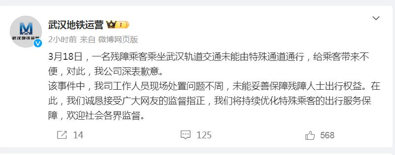 3月22日,武汉地铁官微发布消息称,“3月18日,一名残障乘客乘坐武汉轨道交通未能由特殊通道通行,给乘客带来不便,对此,我公司深表歉意。该事件中,我司工作人员现场处置问题不周,未能妥善保障残障人士出行权益。在此,我们诚恳接受广大网友的监督指正,我们将持续优化特殊乘客的出行服务保障,欢迎社会各界监督。”