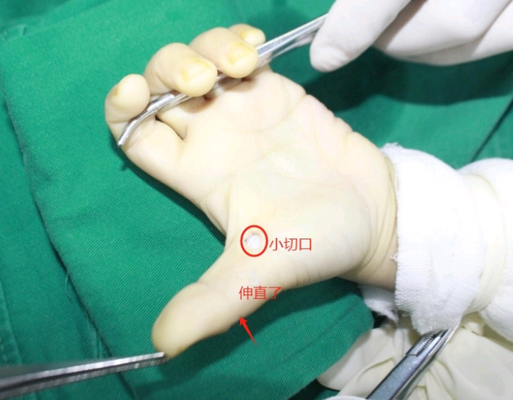 手术治疗是在拇指掌指关节掌侧横纹处做一5至8毫米的小横切口,对腱鞘的狭窄部分进行松解,术后拇指便可自由屈伸。手术仅用时二三十分钟,术后不易复发,而且因切口隐蔽、采用美容缝合,不易形成瘢痕。