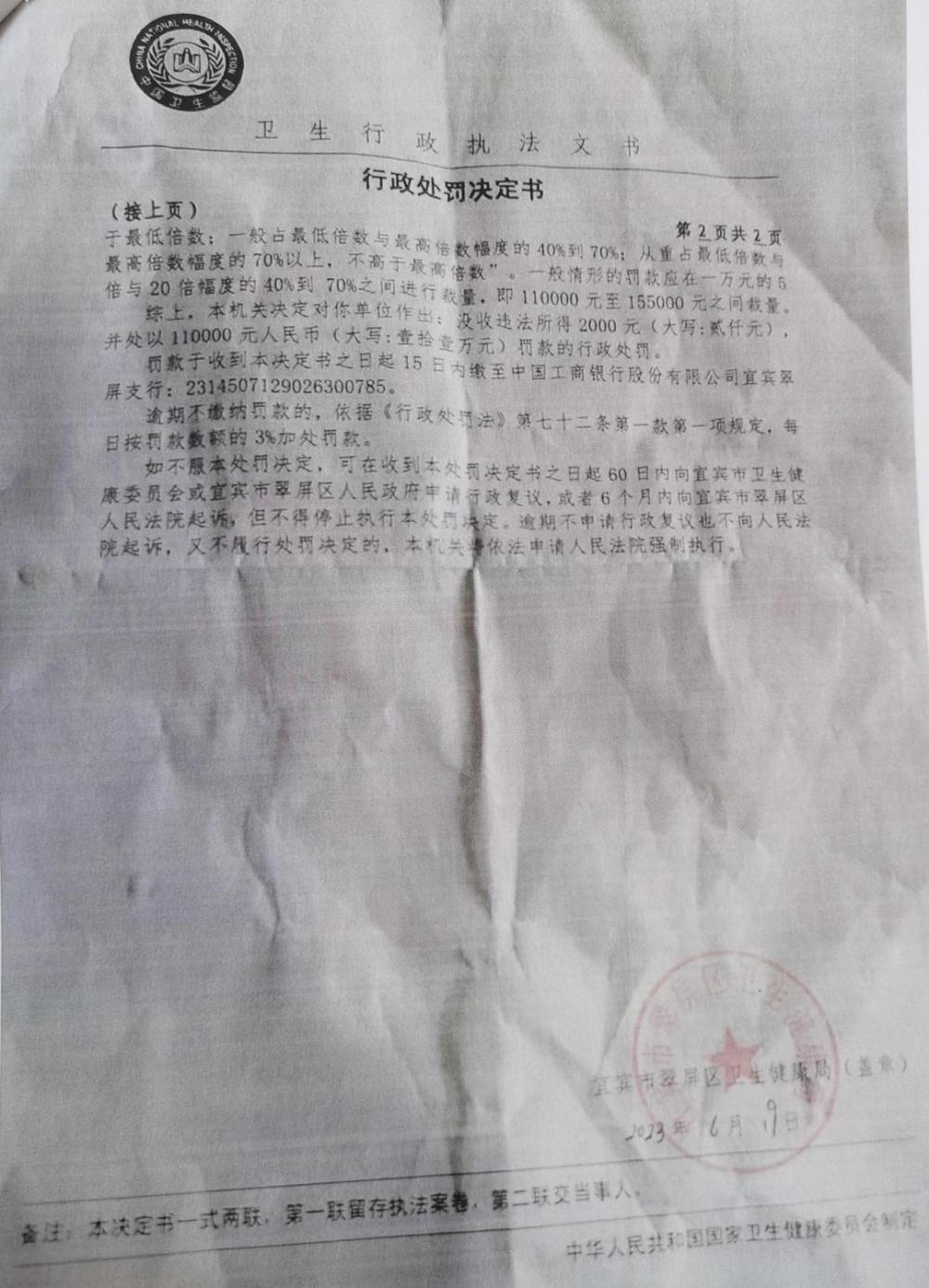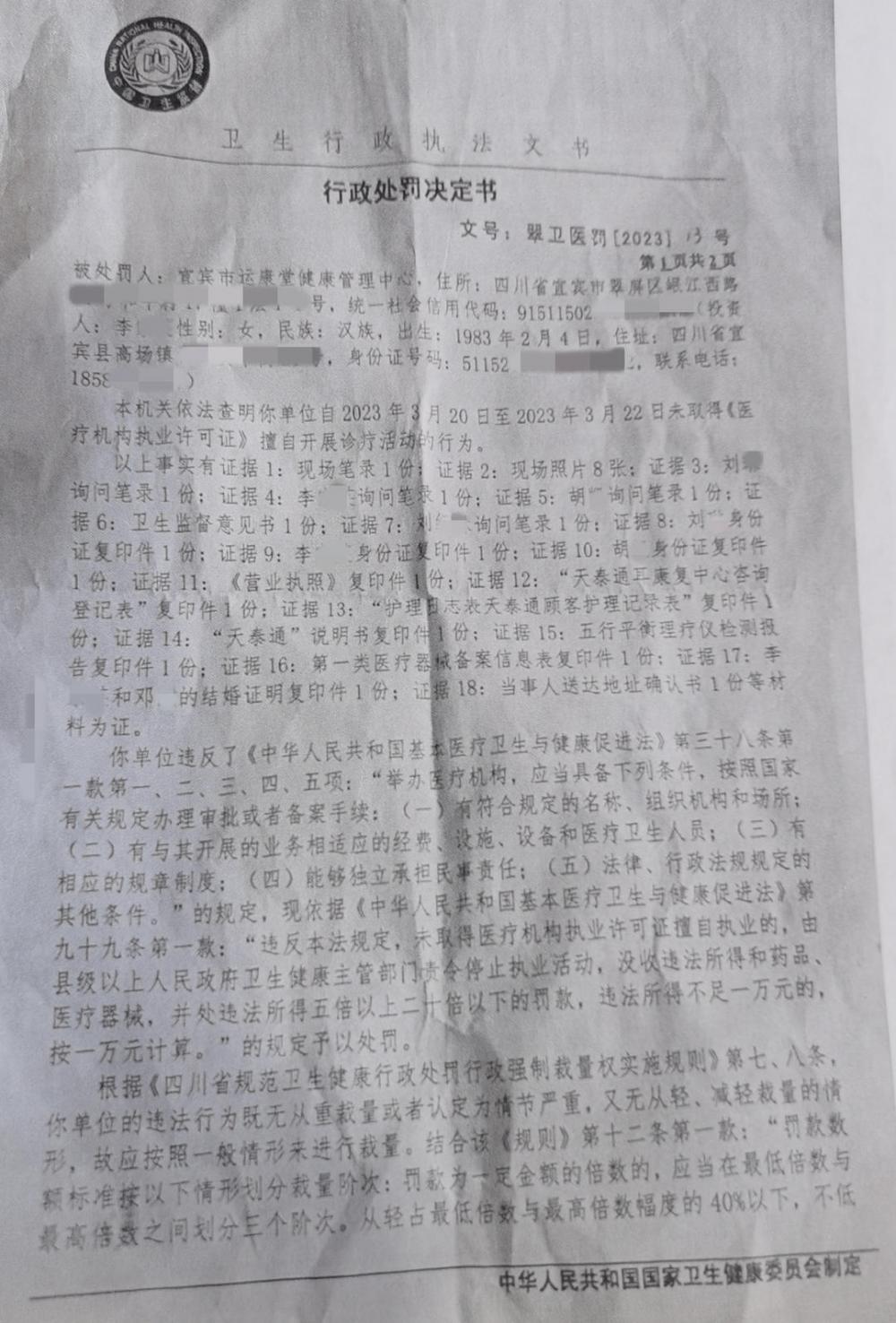 2023年6月19日,翠屏区卫健局作出行政处罚决定,认定运康堂自2023年3月20日至3月22日未取得《医疗机构执业许可证》擅自开展诊疗活动,并对运康堂处以没收违法所得2000元、罚款11万元的行政处罚。处罚决定书还表示,罚款需在15日内缴纳,如逾期不缴纳,每日将按罚款数额的3%加处罚款;如不服处罚决定,可在规定期限内申请行政复议或起诉。