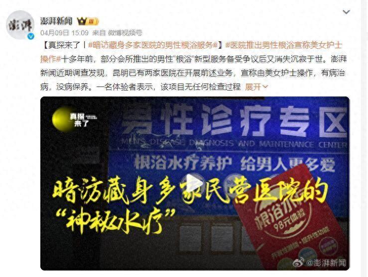 近日,有媒体揭露报道,昆明有两家医院在开展男性“根浴”业务,宣称由美女护士操作,有病治病,没病保养。一名体验者表示,该项目无任何检查过程和诊疗记录病历,无法分辨它到底是正规医疗服务,还是所谓的色情擦边球。4月10日,昆明市卫健委通报发布通报称,已成立联合调查组对涉事三家医院机构调查。