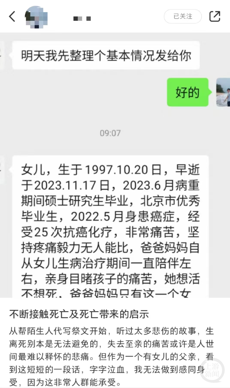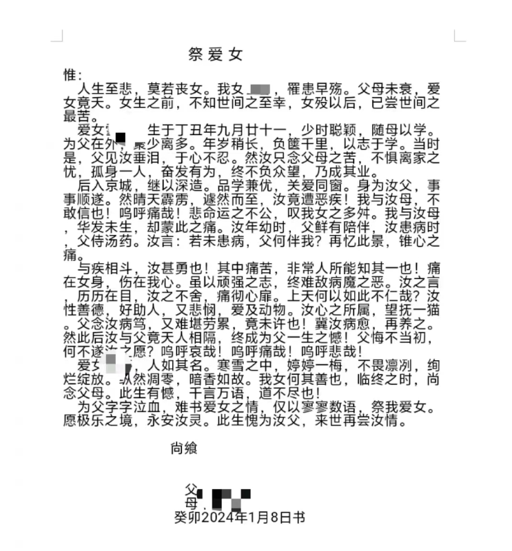 “这个女孩爸爸是乡镇公职人员,妈妈是县城小学老师。她从小就很独立很优秀,以优异的成绩考上了北京一所重点大学。遗憾的是,她前年5月被查出癌症,一边化疗一边准备研究生毕业。去年6月,她病重期间获评北京市优秀毕业生,11月去世。”