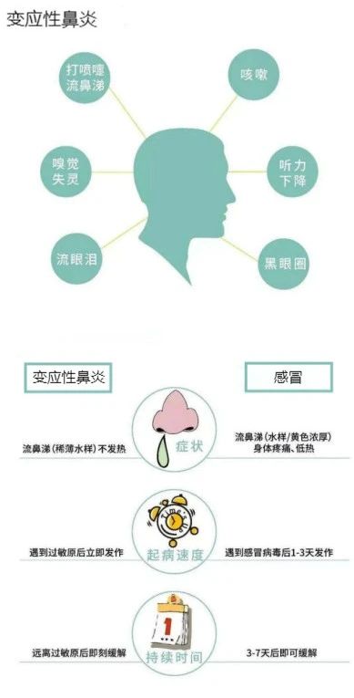 都是打喷嚏、流鼻涕,如何区分是感冒还是过敏性鼻炎发作?于锋介绍,过敏性鼻炎的典型症状主要是阵发性喷嚏、清水样鼻涕、鼻塞和鼻痒,部分伴有嗅觉减退。由于症状与感冒很相似,如何分辨?市民可通过一张图来简单区分: