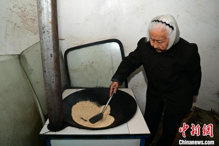 近日,在湖北钟祥杨集村一座农家小院里,鞠兰英把大米放入铁锅,用小火慢慢加热,不停地翻炒,直到白米全部变成杏黄色,香味扑鼻。