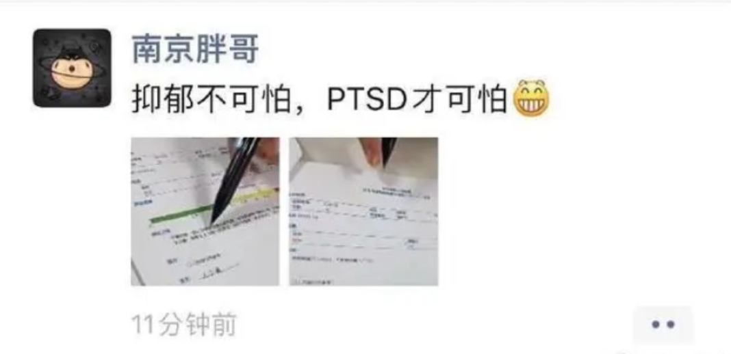 4月29日,南京胖哥邱绍春发布一条朋友圈:“抑郁不可怕,PTSD(创伤后应激障碍)才可怕”。据了解,胖哥近日去精神科就诊,目前被初诊为PTSD和中度抑郁。