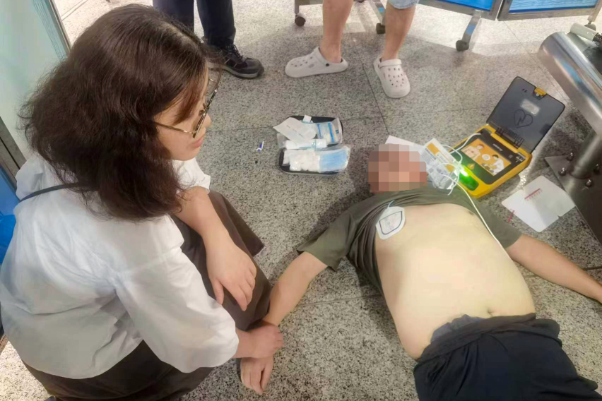 情况危急,陈钧马上开始对阿叔进行胸外心脏按压,同时询问工作人员是否有AED(自动体外除颤器)可供使用。工作人员迅速取来AED,并且快速地贴好了电极片,为阿叔进行了第一次除颤。