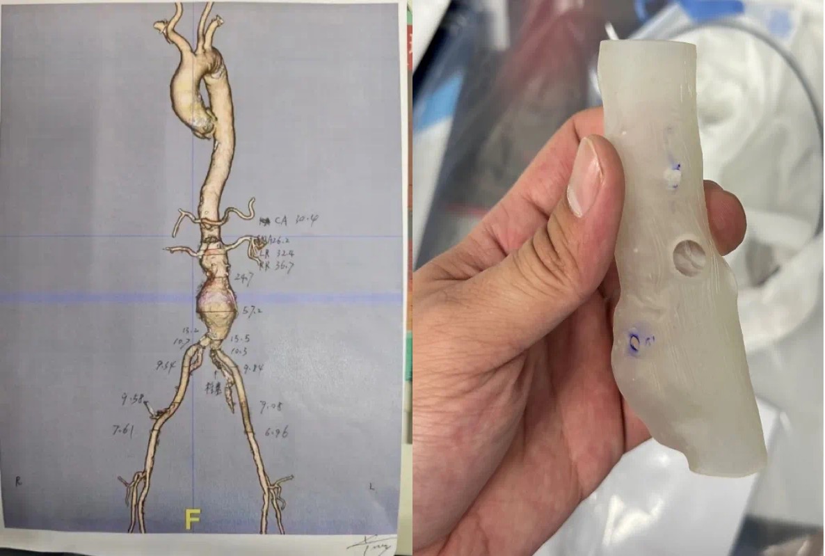 近日,广州医科大学附属第二医院(以下简称“广医二院”)血管外科团队通过3D打印建造4条“人工隧道”,为一名复杂腹主动脉瘤患者“禁区拆弹”,通过实施腹主动脉覆膜支架植入术,在完整封闭动脉瘤的同时,保住患者内脏区四条重要分支动脉。