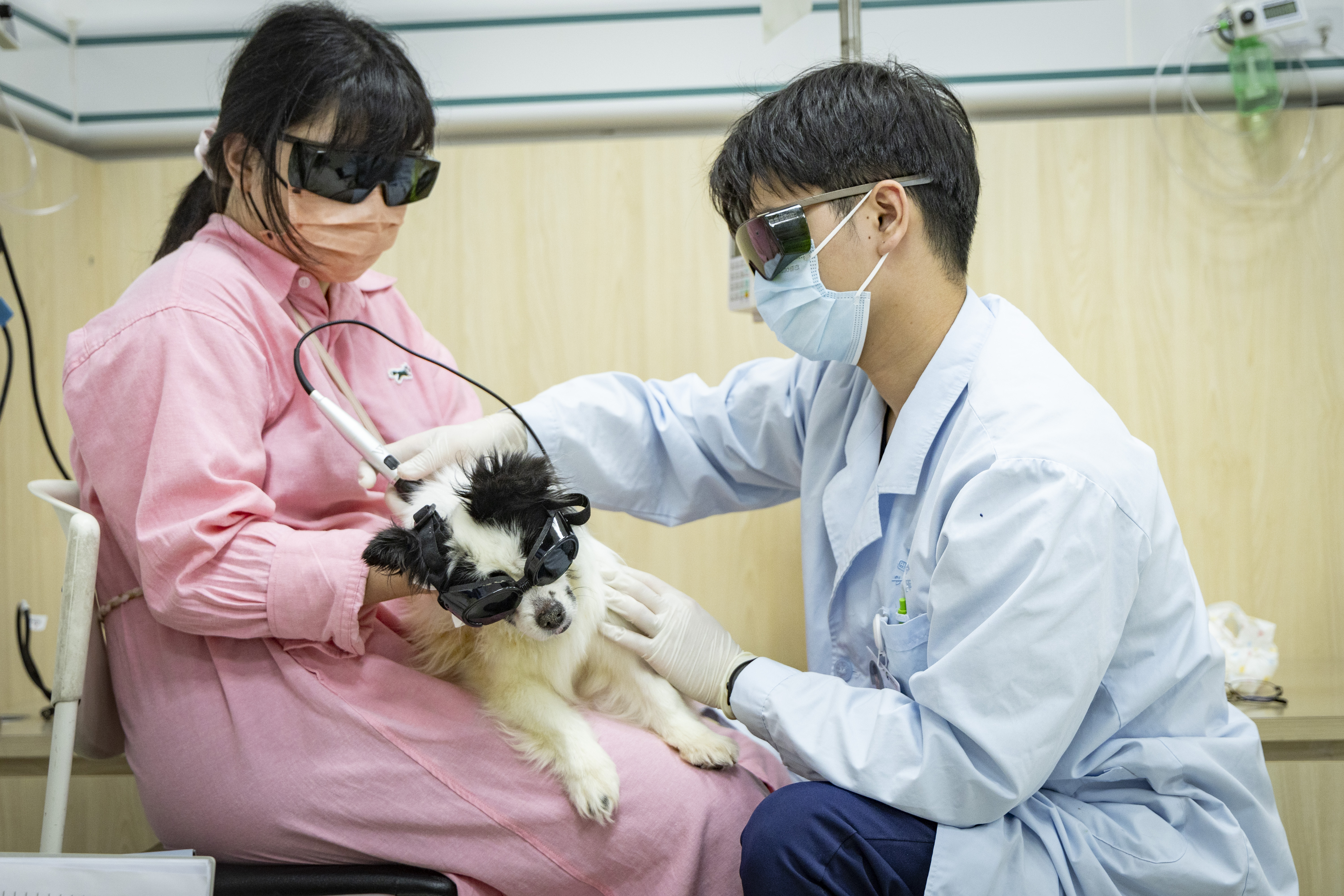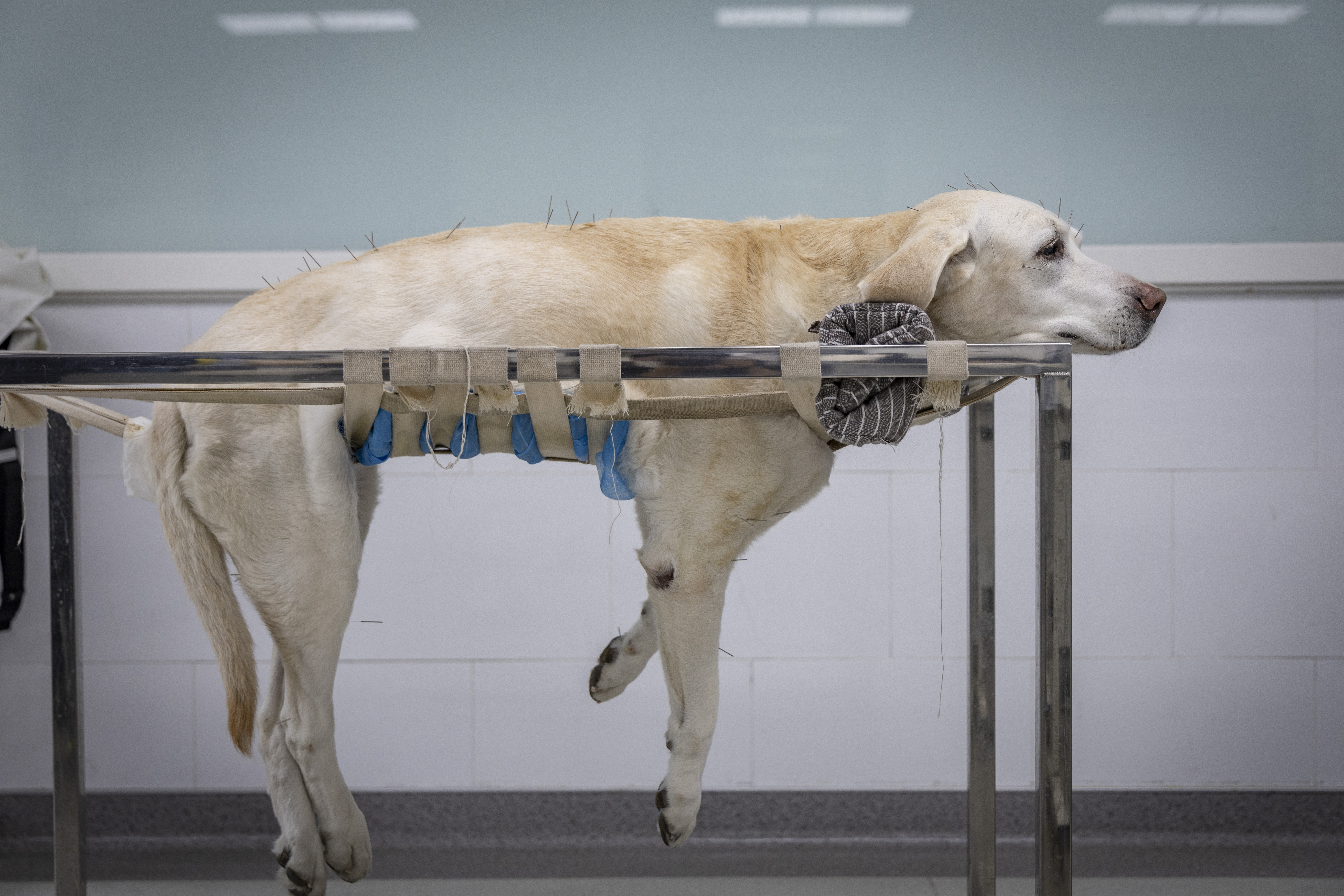 大型犬可以趴在针灸架上,小的猫狗则是趴在桌子上。一只病患一般几分钟就可以扎完,之后留针半小时。“扎上针灸后,它们处于舒缓的状态,很多都是非常安静的。有些宠物主人甚至反映,每次到了要来治疗的时候,自家宠物会表现出非常期待、很想出门的样子。”