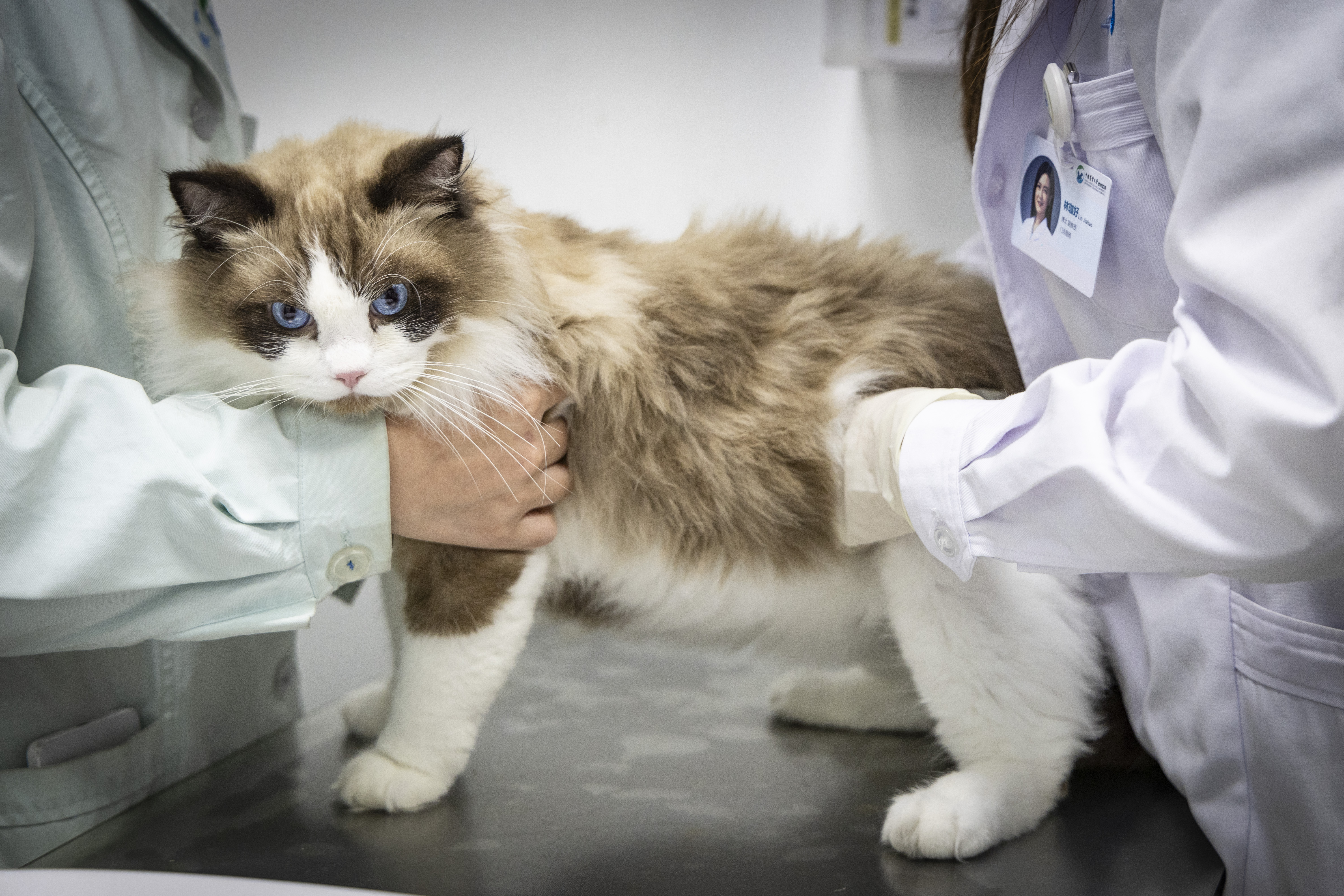 当宠物猫小花被主人放到诊台上时,它微微睁了睁眼。