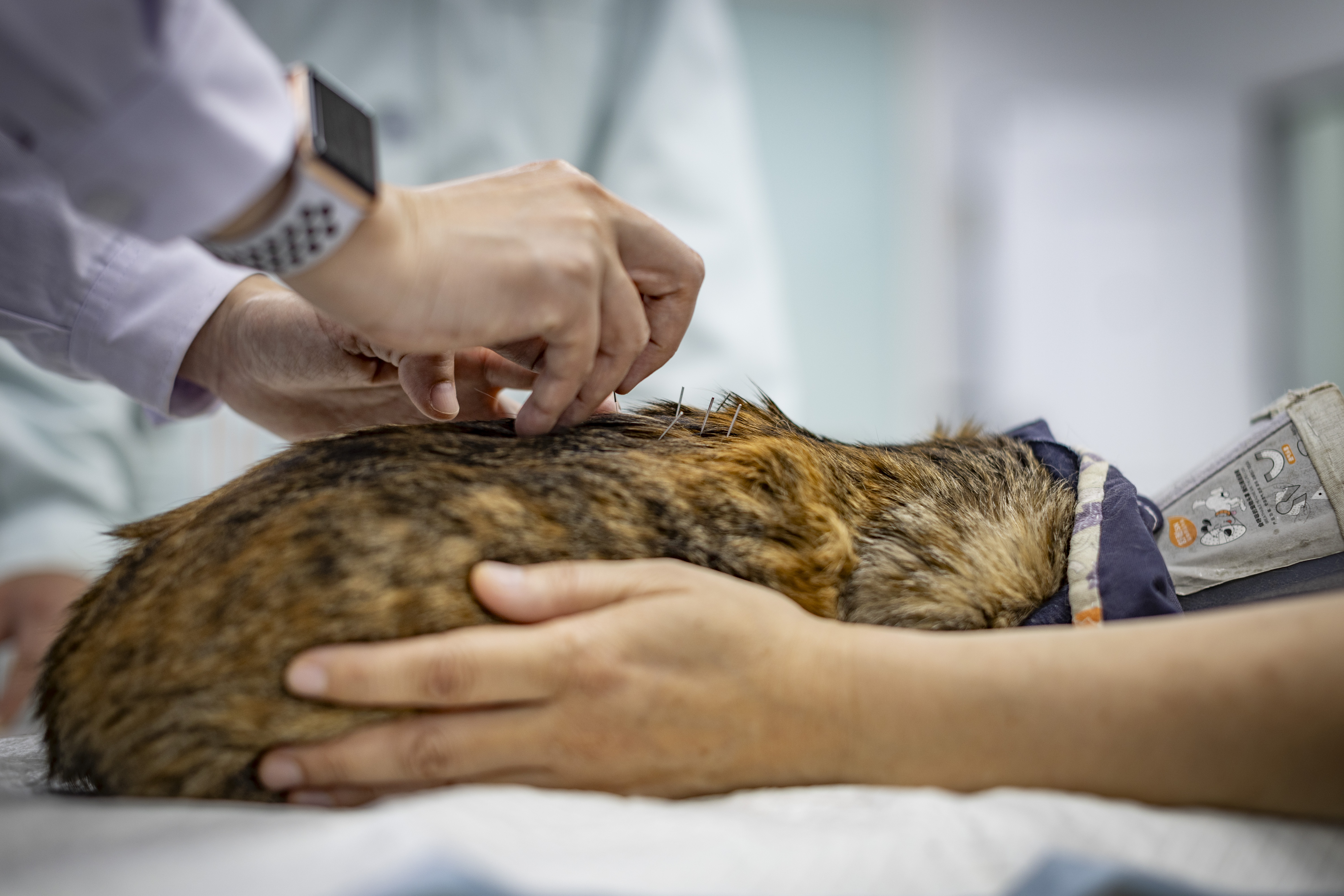 她先用双手轻握住小花的腹股沟处诊脉;又凑近小花的身体,听听声音,闻闻气味;再轻轻扒开背上的毛看看皮肤,扒开嘴巴看看舌头;最后问一问主人小花平时的状态。望闻问切后,针灸是当天诊疗的最后一步。