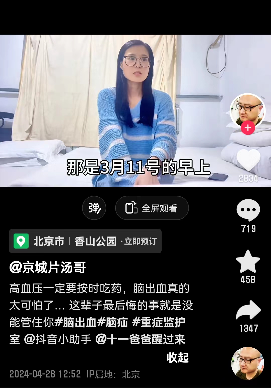 4月27日,其妻子曾在片汤哥个人社交账号上发布视频回应,并没有想到丈夫会突发脑出血,让大家一定要爱惜自己的身体,最后悔的就是没管住他,丈夫手术后依然处于昏迷状态。提及丈夫突发重症的原因,她表示丈夫220斤,有遗传的高血压,二级左右的心功能不全,脂肪肝等。