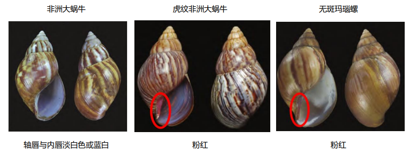 “值得一提的是,非洲大蜗牛与虎纹非洲大蜗牛、无斑玛瑙螺三个近缘物种在外部特征都非常相似,三者的区别在于轴唇与内唇颜色不一样。”何晓芳介绍,非洲大蜗牛的是淡白色或蓝白色,其他两种都是粉红色。目前这三种蜗牛均已入侵到我国。