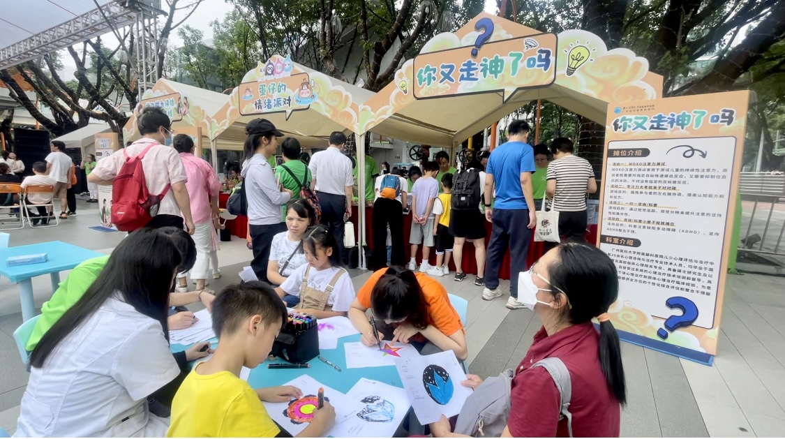 VR体验、小型亲子运动会、儿童青少年心理游戏体验区……科技周启动仪式现场,犹如一个大型游园会。其实,这些都是广医脑科医院不同专科医生现场设置的体验活动。用有趣、互动的方式,让市民贴身感受脑科学与生活的关系,科普精神心理健康知识。