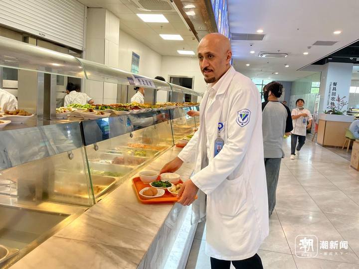 午饭依然是在医院食堂解决的。阿马尔不爱吃甜食,大多点一些高蛋白食品。他熟练地拿起一旁的餐盘,拿了一碗墨鱼炒芹菜,一碗牛肉炒大蒜和一碗米饭,刷卡结账前又从一旁顺了两个鸡蛋。遇到认识的同事,他会专门拐道过去热情地打招呼。