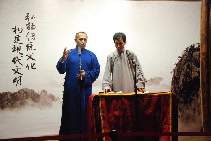 第一次在茶馆听相声时,他迷茫地捧着手里的茶杯,完全搞不懂大家的笑点在哪里,只觉得好奇,为什么是“听”相声而不是“看”相声?后来,去的次数多了,他越听越明白,也渐渐喜欢上了这些“包袱”,“从正常交流到和大家一起笑,我觉得对我的汉语水平来说是一个很大的提升。”