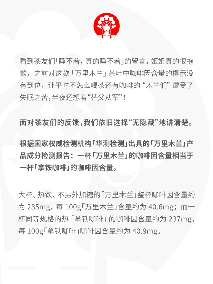 5月30日,霸王茶姬回应称,一杯万里木兰的咖啡因含量约等于一杯同等规格的拿铁咖啡。所以,这才导致很多平时很少喝咖啡或者比较习惯喝淡茶的茶友们在饮用万里木兰后“睡不着”。