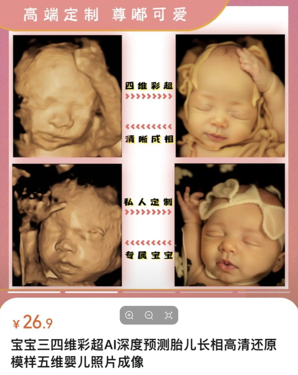 在电商平台上,利用四维彩超图生成一张宝宝照片最低只需6.8元,等待半小时就能出片,最火的商家已接了上万单。在某微信小程序,用户也可自行上传四维彩超图,免费生成预测照片。