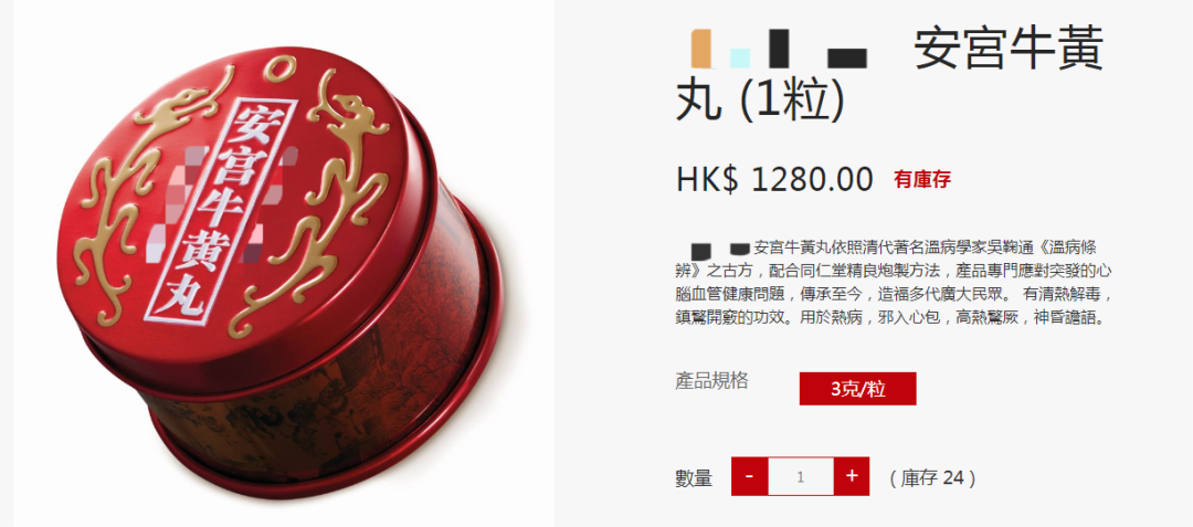 6月11日,某知名品牌官网显示,港版1粒装安宫牛黄丸价格调整为1280港元(折合人民币约1189元),6粒装安宫牛黄丸价格为7680港元(折合人民币约7133元),每粒规格为3克。此前,每粒港版安宫牛黄丸售价为1060港元(折合人民币约985元),一粒价格涨幅超过20%。