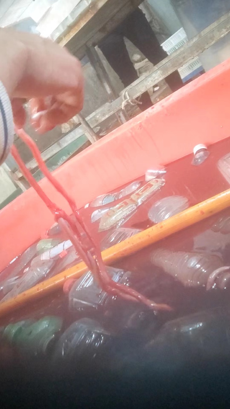 记者观察发现,工作人员踩踏后的鹅肠,会被送往流水线上进行过水清洗,然后放入存有红色液体的器皿中浸泡,原本米白色的鸭肠,变为粉红色。“里面是血水,过一下鹅肠看起来会更新鲜,更有卖相。”一名工作人员解释。