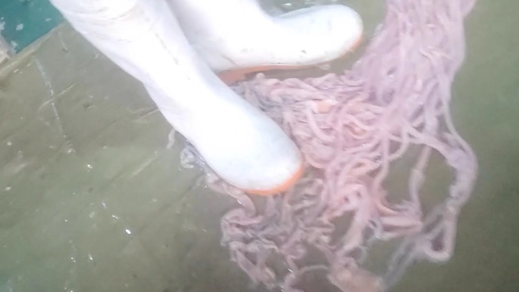 尽管多次被监管部门检查,鹅肠车间的环境仍不容乐观。在车间内,记者看到工作人员穿着胶鞋,直接踩向摆放在地面上的鹅肠,“踩一踩,更干净。”