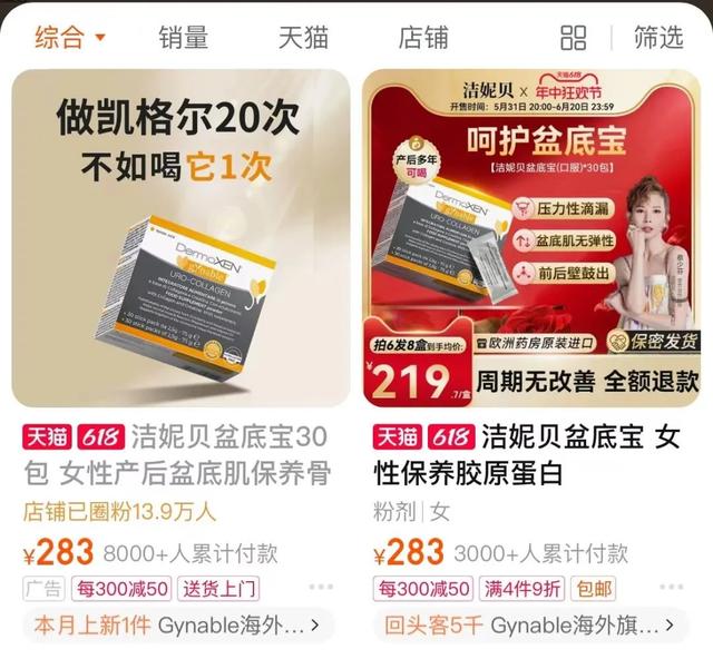 在淘宝上搜索“盆底肌修复胶囊”,排在第一的是一款名为“洁妮贝盆底宝”的口服产品,月销量超过一万件。齐鸥购买的就是这种产品,今年2月,她消费约285元,在天猫国际“Gynable海外旗舰店”购买了一盒。