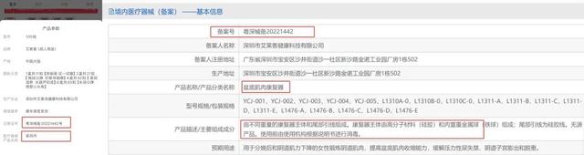 在天猫平台上,奥昌医疗器械专营店售卖的外用凝胶产品“紧润丹”,产品参数中使用的注册证号为“粤深械备20221442”。新京报记者查询国家药品监督管理局网站发现,该注册证号对应的产品名称却是“盆底肌肉康复器”。同样,另一家店铺肤草堂医疗器械专营店售卖的“紧润丹”“紧致丹”私处紧致抑菌液”等产品,使用的注册证号也是“粤深械备20221442”,与该注册证号对应的产品不符。