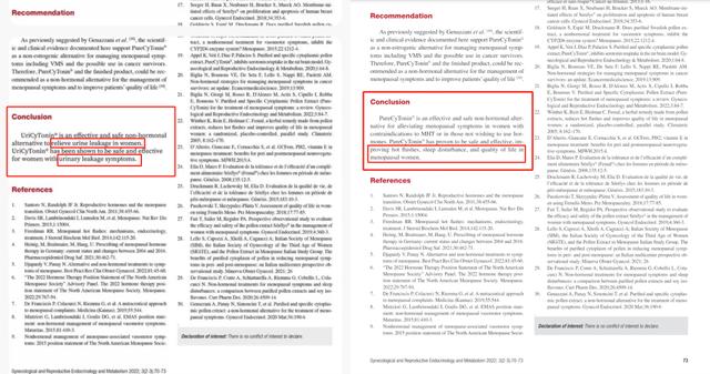 记者对比发现,商品详情页所附报告除了修改标题,还修改了结论。原报告提到,PureCyTonin®是一种有效、安全的非激素产品,可改善更年期妇女潮热、睡眠障碍等问题。而所附报告则写明,UriCyTonin®是一种有效、安全的改善女性漏尿的非激素产品,被证明在女性漏尿方面安全有效。