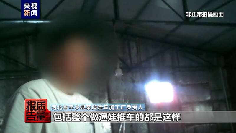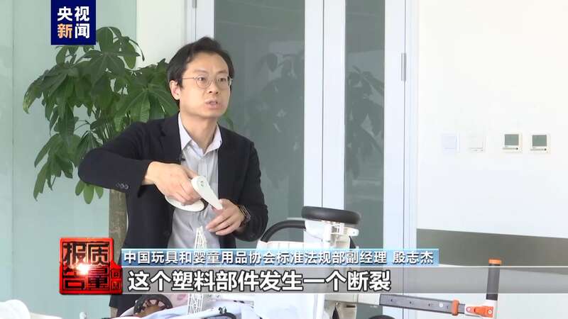 中国玩具和婴童用品协会标准法规部副经理 殷志杰:经过检测后,这个塑料部件发生断裂,这种情况我们初步判断它是加了比较多的碳酸钙,那么它的成本是能低10%到20%左右,这样的话企业能省不少钱。断裂的金属件,用的是相对壁厚比较薄的一个黑皮管的材料,会比底壁厚厚的黑皮管,以及质量比较好的白皮管,价格便宜30%到40%。
