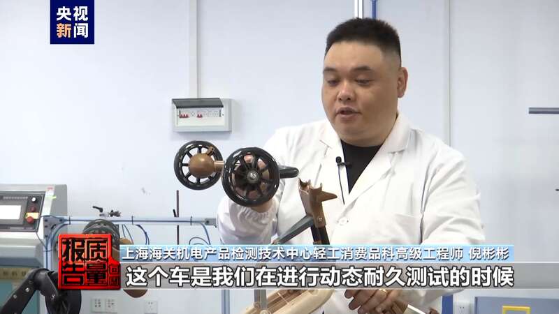 上海海关机电产品检测技术中心轻工消费品科高级工程师 倪彬彬:国家标准要求推车在经过36000次循环之后,车子整体结构不能失效,并且能够正常使用。这款车在不到1000次循环的时候,就发生了扶手杆断裂的情况。