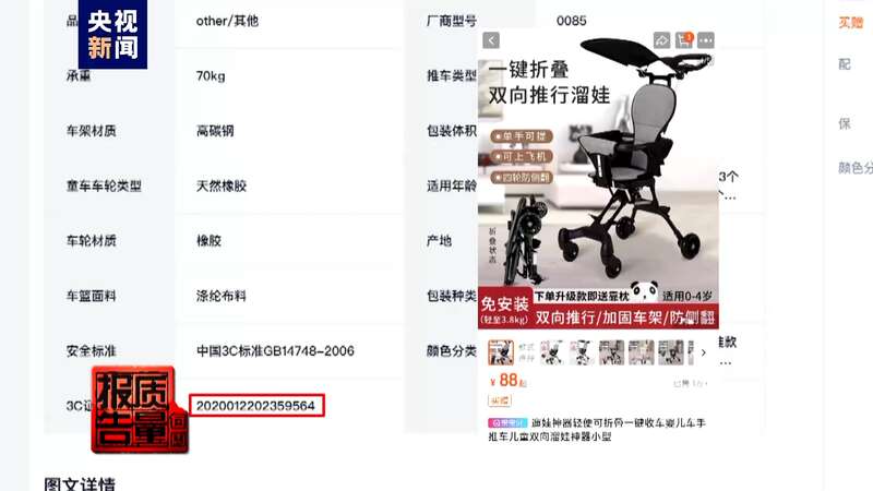 另外,有4款检测不合格的产品在其网店网页上虽然标注了3C证书编号,但是记者在市场监管总局官网上逐个查询后发现,两张证书对应的产品是骑乘车辆玩具,一张证书对应的产品是儿童摇摆车,而另一张证书对应的产品为儿童三轮车,也就是说这4款产品网店网页标注的3C证书编号对应的产品都不是遛娃车,涉嫌冒用3C证书。
