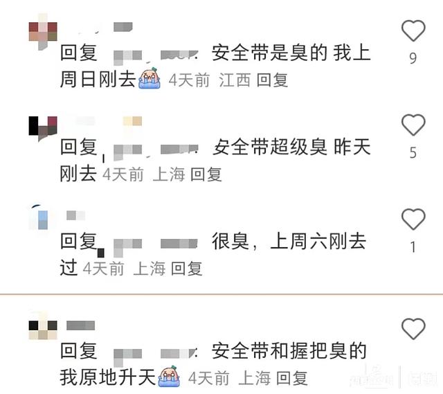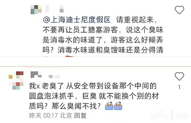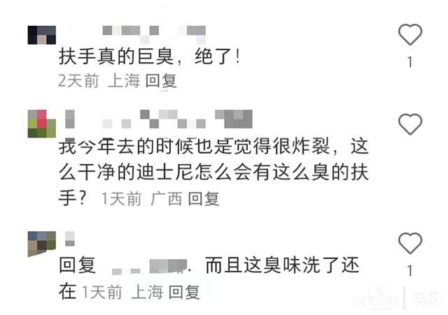 “今年去的时候也觉得很炸裂,看上去非常干净的迪士尼怎么会有这么臭的扶手?”“而且,这臭味洗了后还在。”“安全带是臭的,我上周日刚去。”“安全带超级臭。”“安全带和握把臭得我原地升天。”