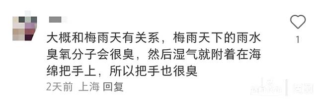 “大概和梅雨天有关系,梅雨天下的雨水臭氧分子会很臭,然后湿气就附在把手上,所以把手也很臭。