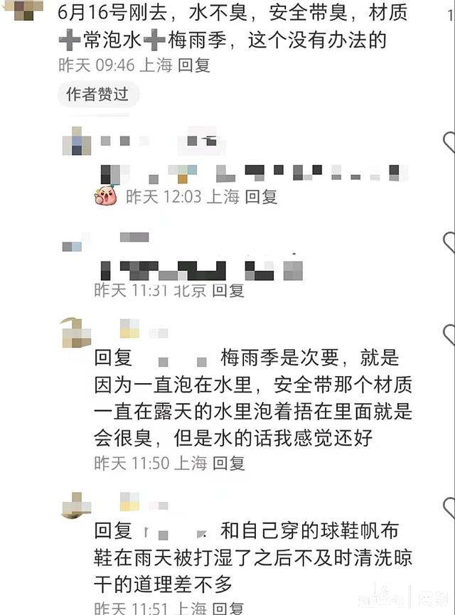 “水不臭,安全带臭,材质加常泡水加梅雨季,这个没有办法的……梅雨季是次要,就是因为一直泡在水里,安全带那个材质一直在露天的水里泡着捂在里面就是会很臭,但是水的话我感觉还好。和自己穿的球鞋帆布鞋在雨天被打湿了之后不及时清洗晾干的道理差不多。”