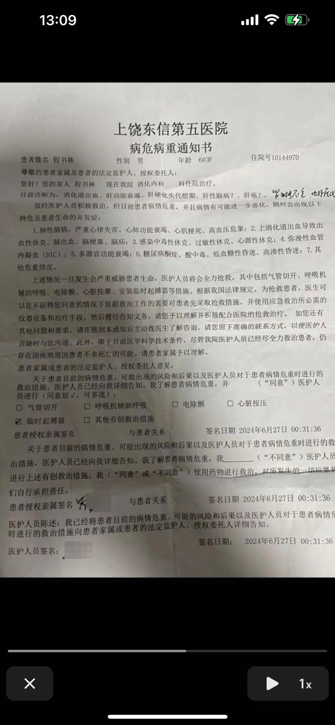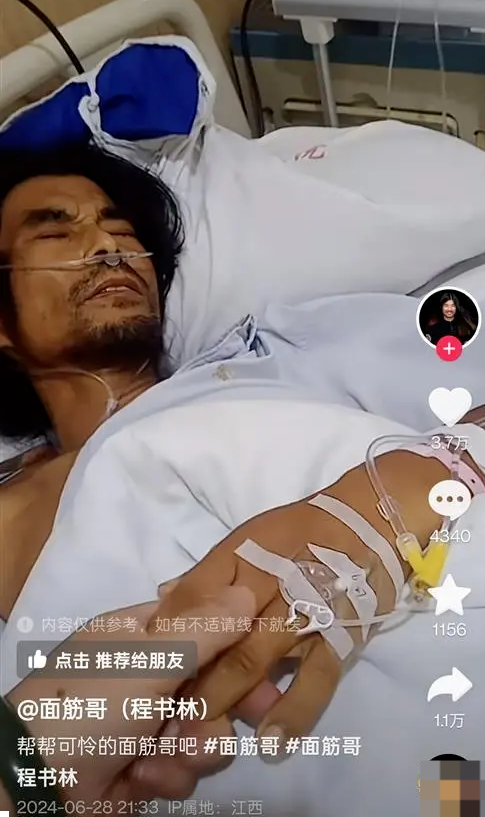 在程书林的抖音账号里,记者看到,主页置顶了3段视频作品,内容均与其病情相关。视频中的文字称,“面筋哥”6月26日晚上9:38在家突然晕倒,家人马上拨打120急救,将其送往医院抢救。27日早上6点左右,他被送往ICU病房。目前,医生说是肝癌晚期。“面筋哥”病了好多年,“我们发视频是因为我们没有办法了,只是想救救面筋哥,求求大家帮帮他。”视频画面显示,“面筋哥”躺在病床上正在接受治疗。