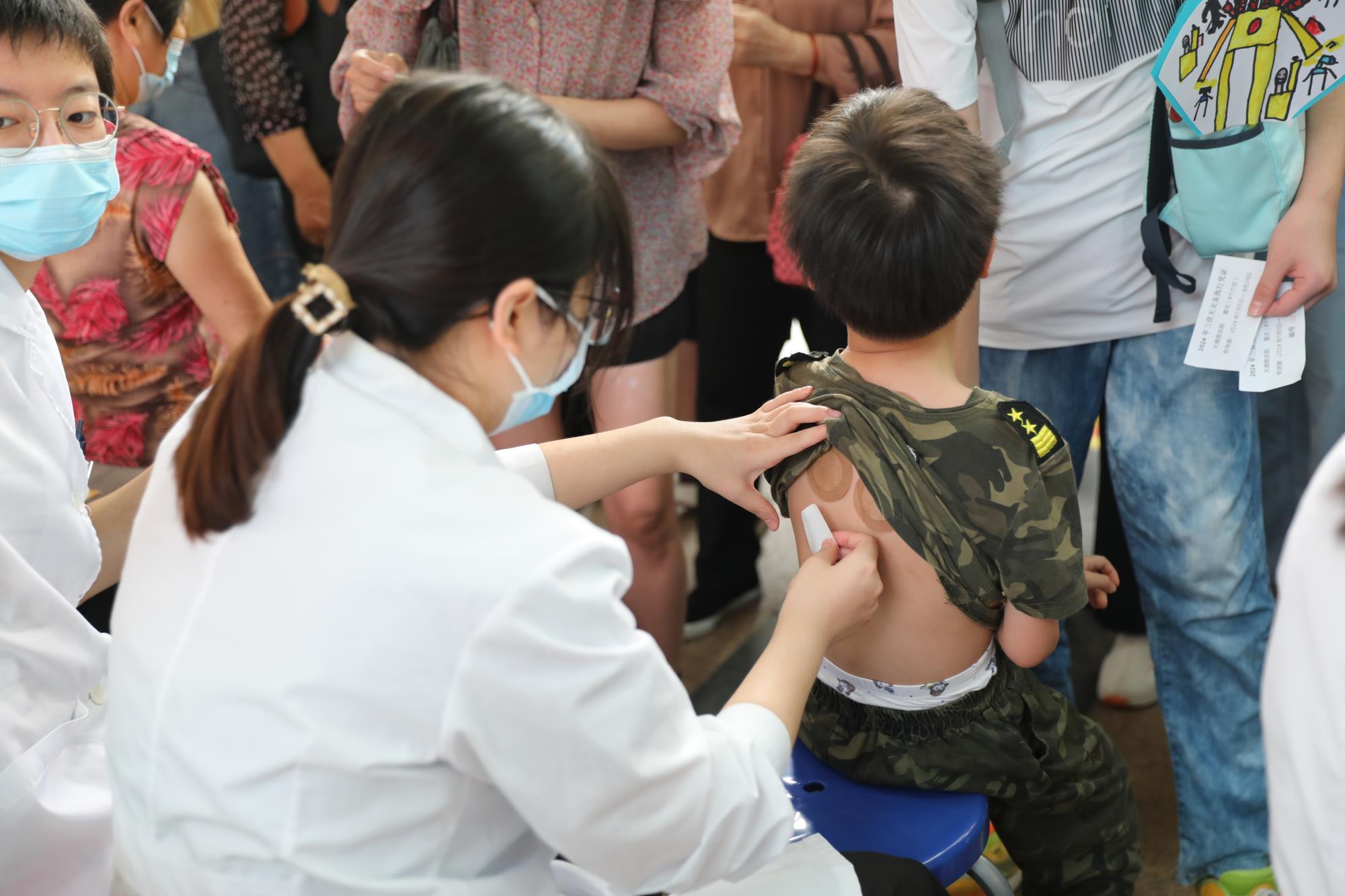贴灸现场,既有上班族年轻人、街坊阿伯阿婆,也有不少家长带着孩子前来。