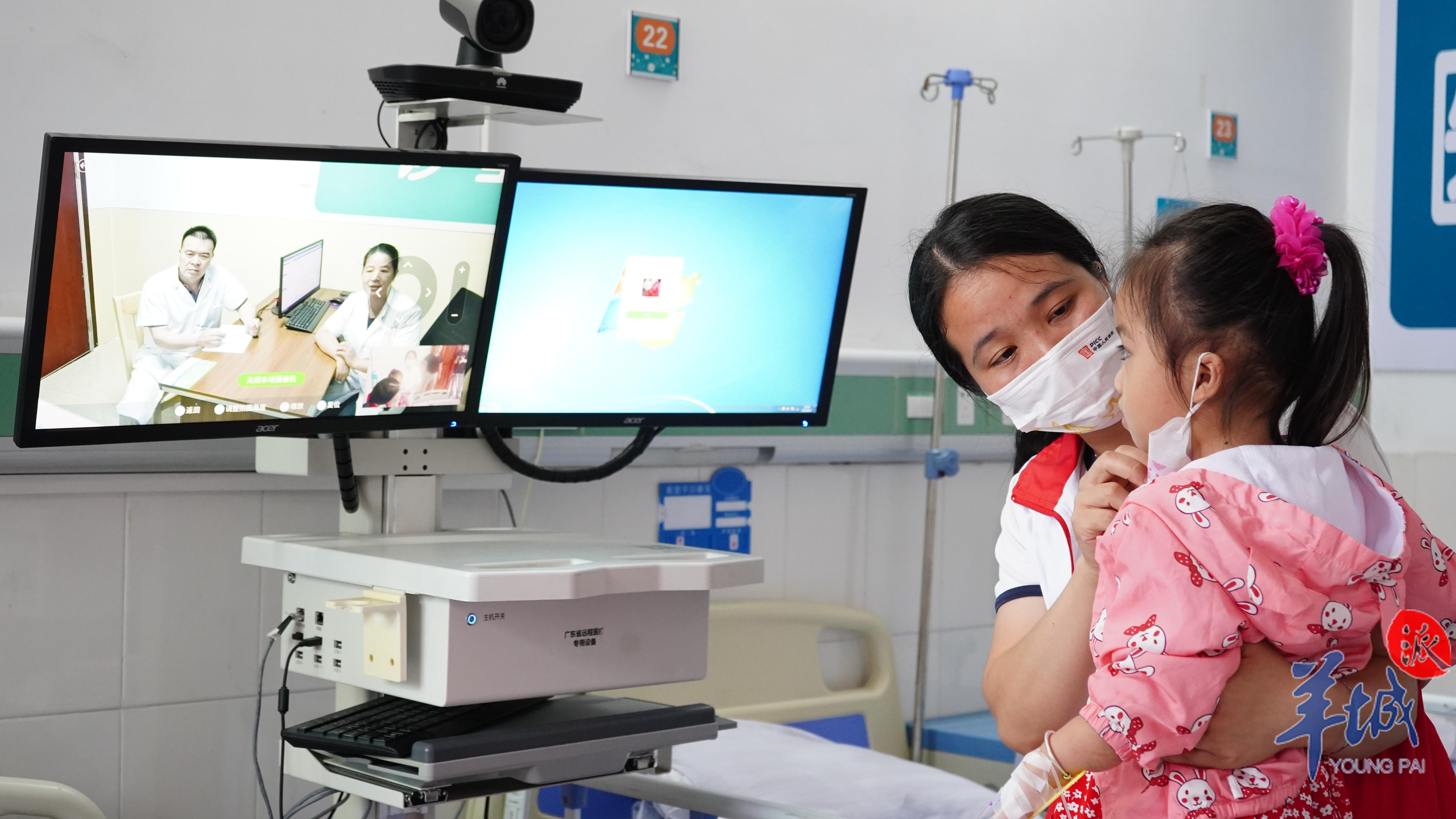 “宝贝,对着摄像头把舌头翘起来让我检查一下……没太大问题,多喝水,多补充维生素。”在曲江区医共体总院大塘镇分院(大塘镇中心卫生院)的医共体远程会诊室,屏幕里来自曲江区医共体总院(曲江区人民医院)的儿科专家正在远程查看诗诗(化名)的恢复情况。“我先按您的医嘱给她打消炎针,之后再观察一下是否还有发烧咳嗽。”卫生院医师一边扶着诗诗,一边回应看诊专家。
