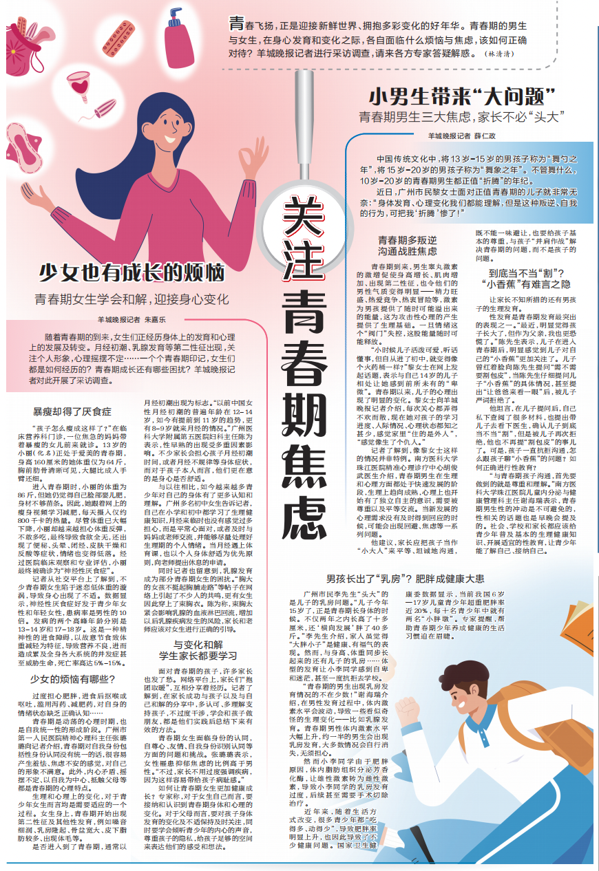 随着青春期的到来,女生们正经历身体上的发育和心理上的发展及转变。月经初潮、乳腺发育等第二性征出现,关注个人形象,心理摇摆不定……一个个青春期印记,女生们都是如何经历的?青春期成长还有哪些困扰?羊城晚报记者对此开展了采访调查。