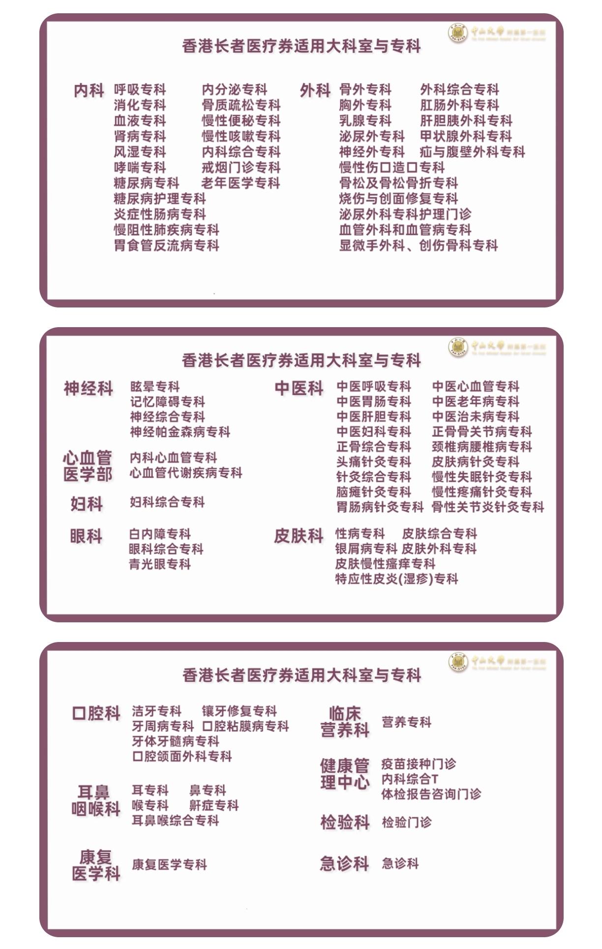 目前长者医疗券适用于中山一院15个科室(含85个专科门诊,见附表),提供预防性、治疗性及康复性的基层门诊医疗服务。