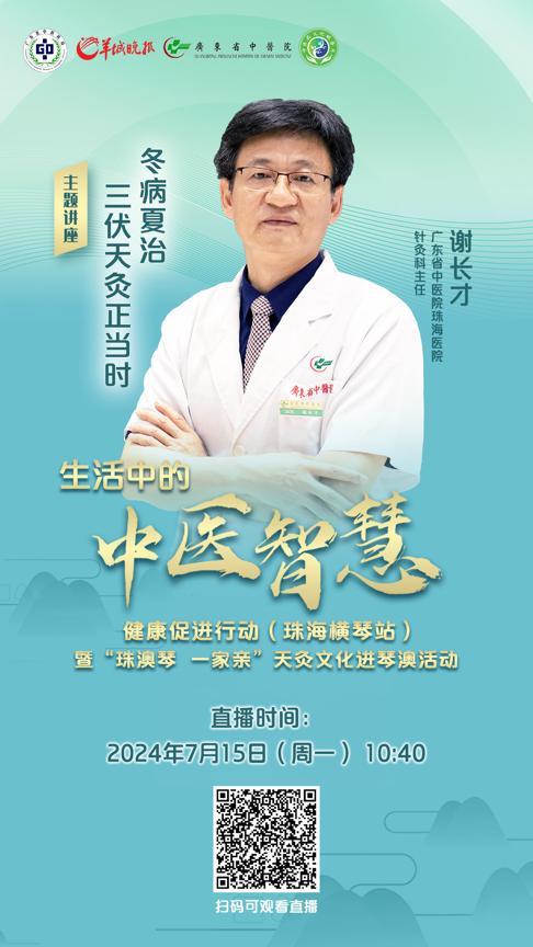 名医名报携手,共促健康科普!7月15日(周一),“生活中的中医智慧”健康促进行动暨“珠澳琴 一家亲”天灸文化进琴澳活动将在珠海横琴举行,为珠澳居民带来一场中医文化的盛大体验。