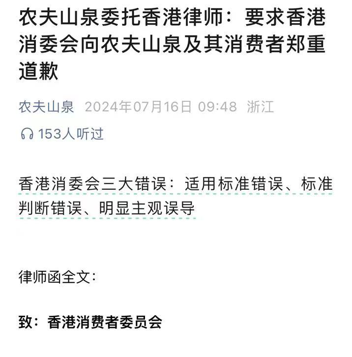 7月16日下午,据媒体最新报道,香港消委会已收到农夫山泉代表律师的信件,正进行研究及跟进。如有进一步消息,消委会将适时公布。