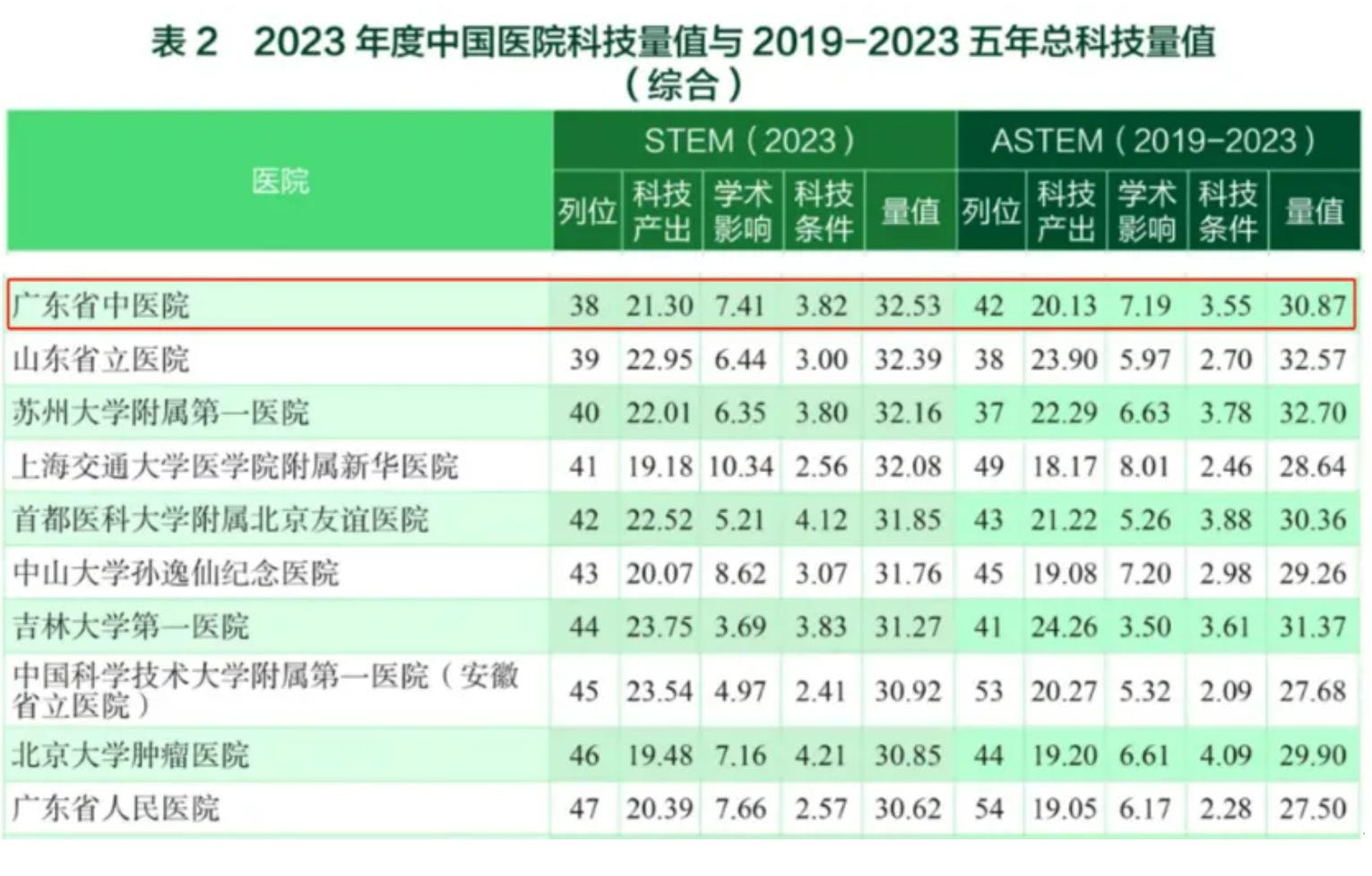 7月19日, 2023年度中国医学院校/中国医院科技量值暨2019-2023五年总科技量值正式发布。广东省中医院2023年度科技量值排名全国第38名,五年(2019-2023)总科技量值排名全国第42名,两项排名均居全国中医医院第一名。