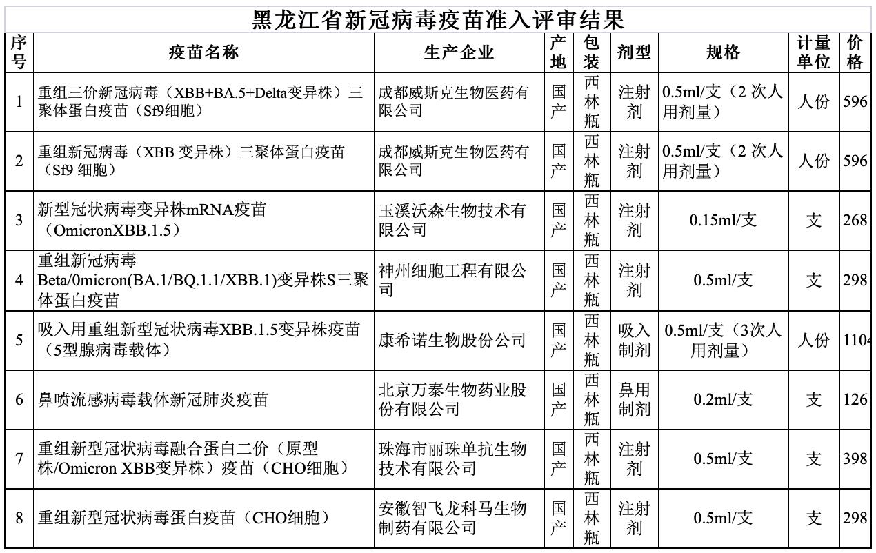 7月24日,黑龙江省公共资源交易网发布《黑龙江省新冠病毒疫苗准入评审结果公告》,共计8款新冠疫苗入选。其中,单次接种价格最高的是丽珠集团的重组融合蛋白二价(原型株/XBB)疫苗,价格为398元;价格最低的为万泰生物的鼻喷流感病毒载体疫苗,价格为126元;其余的单次接种价格都在300元左右。
