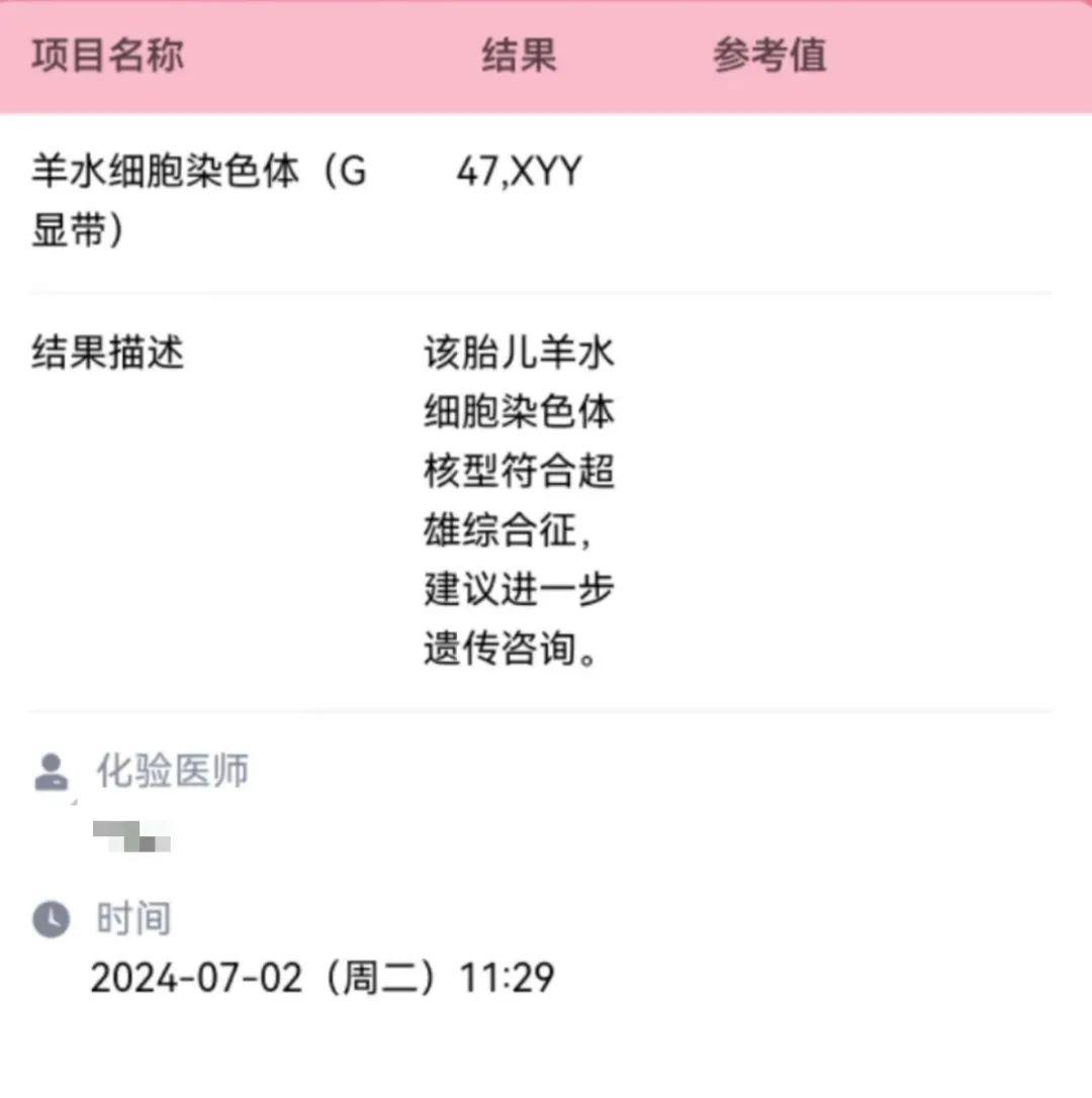从做羊水穿刺到最终结果出来,一共过了三周。这是郑秋觉得人生中最漫长的三周,她抱着一丝侥幸心理,祈祷检查能够翻盘,但最终结果让郑秋心灰意冷——“47,XYY”。